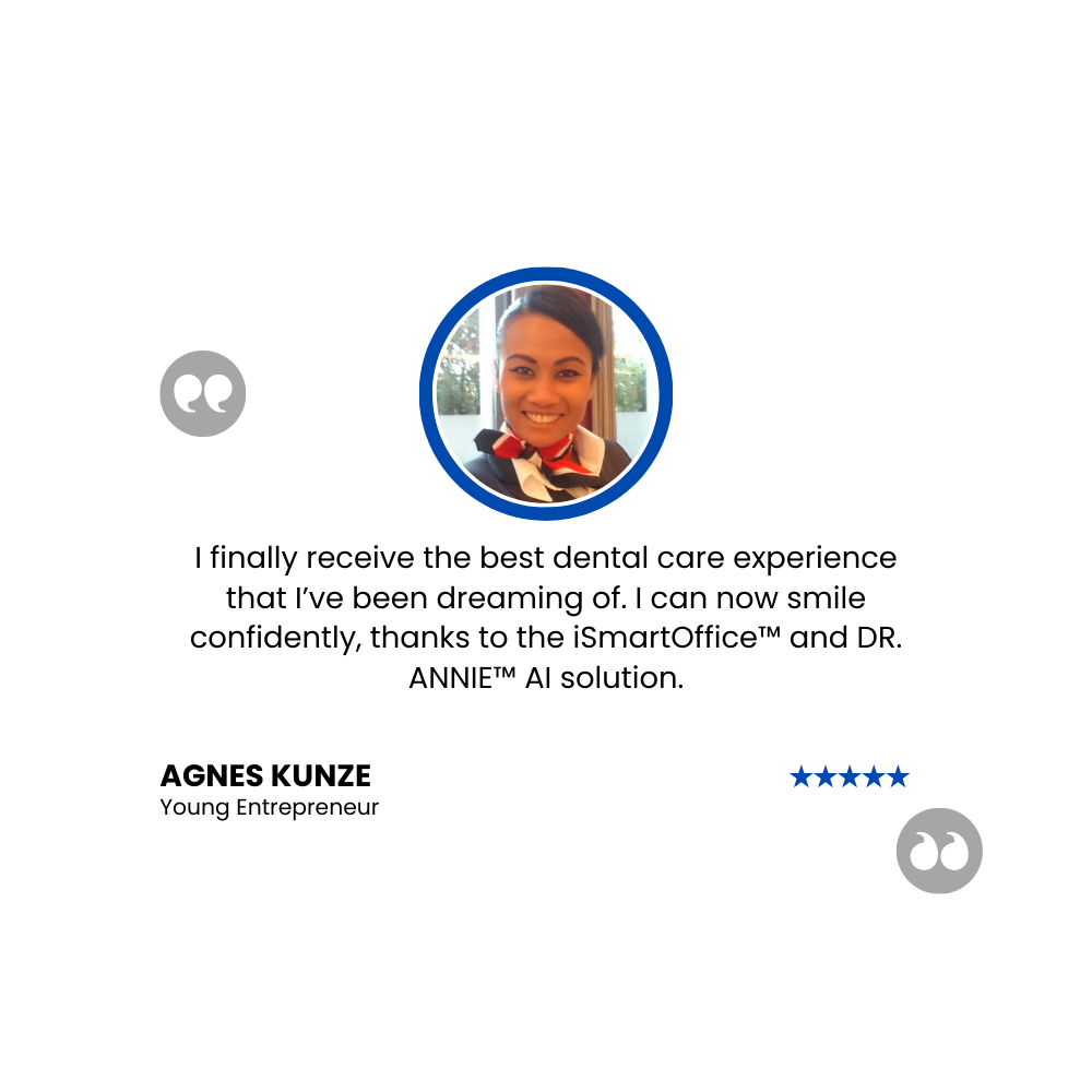 iSmartOffice™ has DR. ANNIE™, a Data Research Artificial Neural Network Intelligence Expert system. It is a real-time AI-based dental needs evaluation assistant to help people seeking help identify their dental needs.